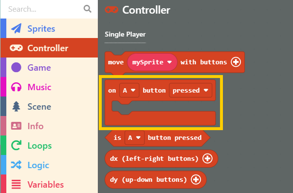 We want the attack timing to be controlled by the player, so click on the “Controller” category and drag out the “on [A] button [pressed]” block.