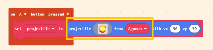 - projectile from sprite: The second block, as the name suggests, creates projectiles from a “Sprite.” In “Space Destroyer,” the laser beams fired by the fighter jet are created using this block.