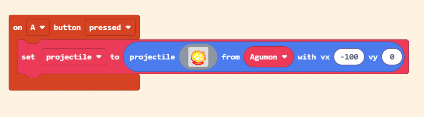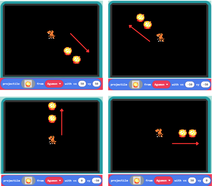 Combine these two blocks. You can draw the “Pattern” for the projectile (e.g., a small flame) or select one from the Gallery. Next, select the variable name of the player-controlled sprite. The “vx” and “vy” at the end represent the “Velocity” in the X and Y directions, respectively. The adjustable range is -100 to 100.