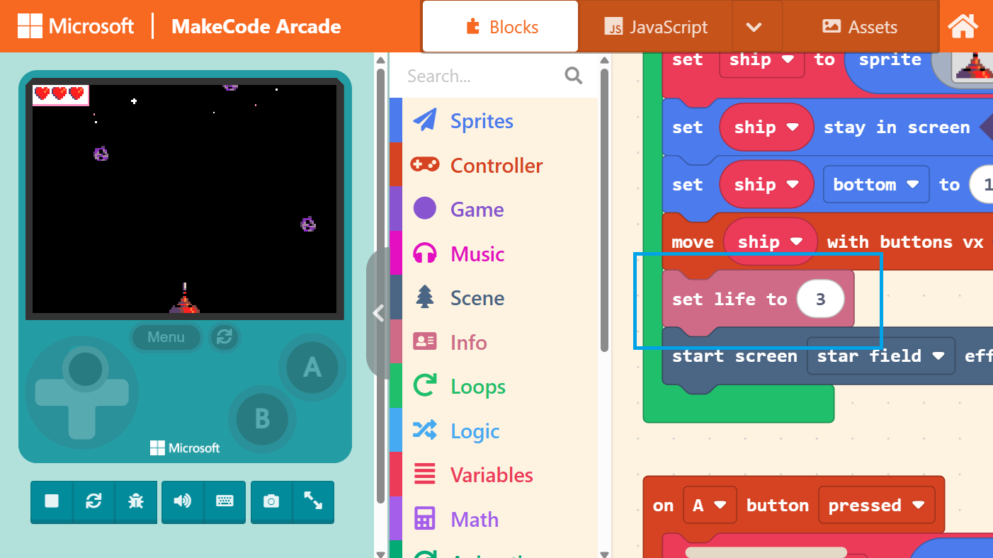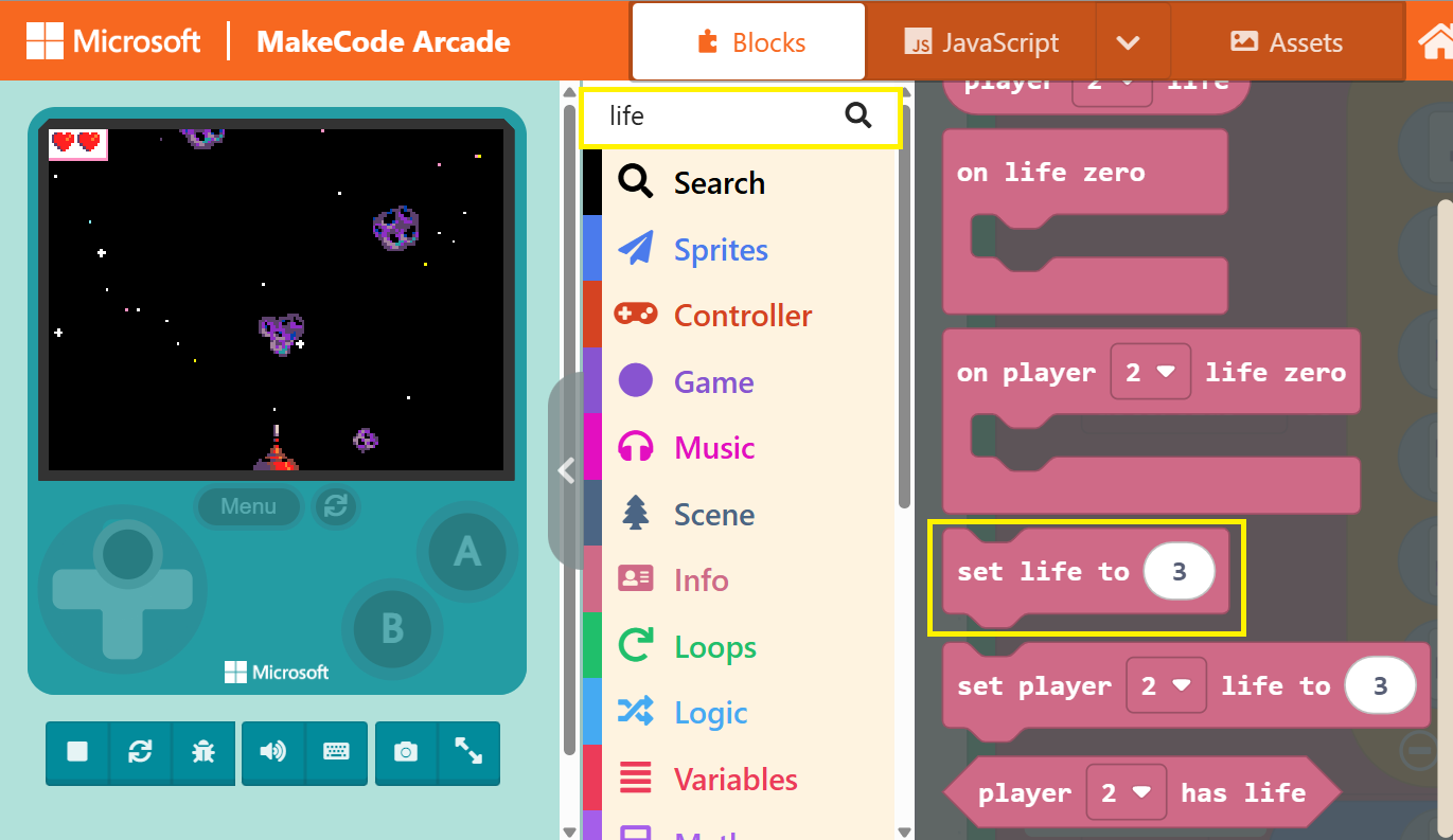Official blocks are actually color-coded. For instance, the “set life to ( 3 )” block we just searched for is pink. Blocks with similar functions will share the same color. Therefore, you can also use color as a guide to look back at the “Block Toolbox” and locate the blocks you need.