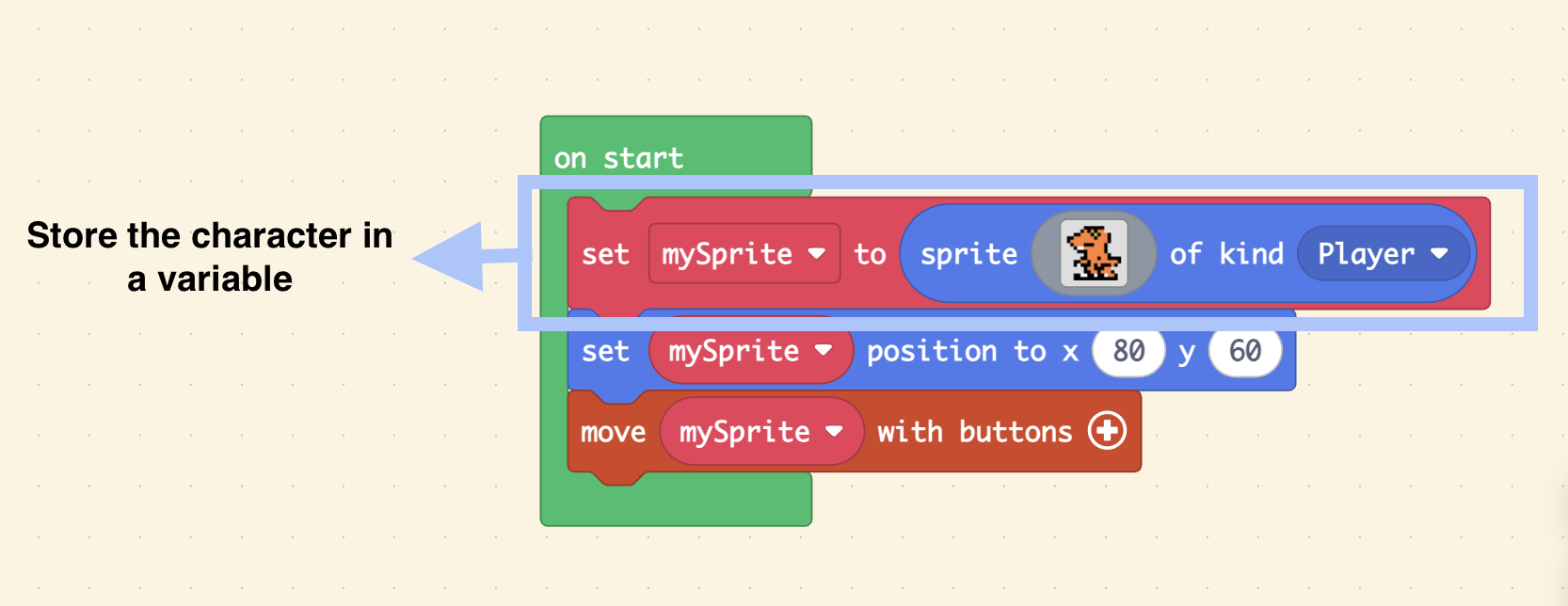 Let’s return to the code. During the sprite creation process, we placed our designed sprite into a “Variable.” Just like our understanding of the box metaphor: once the sprite is stored, the data won’t change unless we modify it.