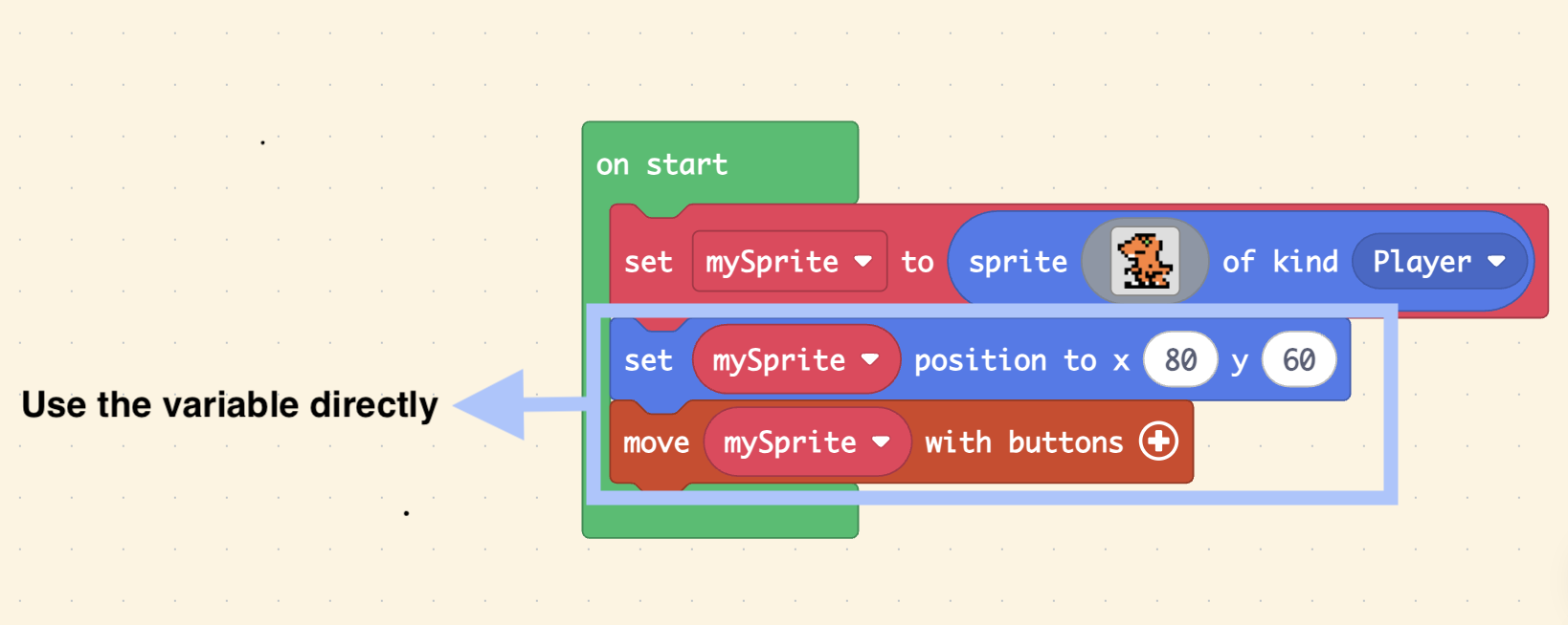 We can understand that the variable “mySprite” is equivalent to the “Sprite (Orange Dinosaur).” So, when we set the position of “mySprite” or use the controller to move “mySprite,” we are effectively controlling the “Sprite (Orange Dinosaur).”