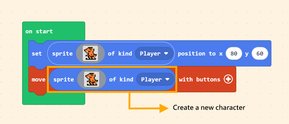 This is because the block “sprite [ ] of kind (Player)” essentially means “Create a NEW Sprite.” If you use this block again in a movement command, you are creating a second sprite—one positioned at (x: 80, y: 60), and another separate one that moves with the controller. This is why you see a “shadow clone” (duplicate) in the Game Simulator.