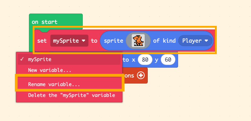 Click on the variable name within the block, and select “Rename variable…” from the dropdown menu to give it a new name.