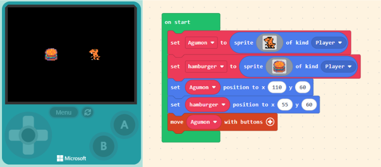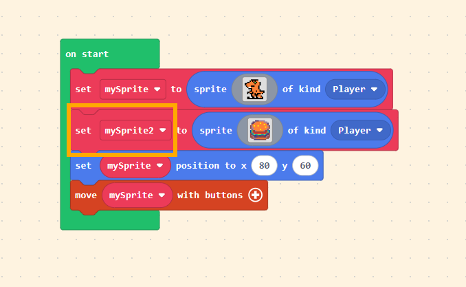 Let’s give these variables meaningful names! The sprite generated by default appears in the center of the screen. Let’s use the “set [mySprite] position to x ( 0 ) y ( 0 )” block we learned earlier to change the positions of these two sprites.