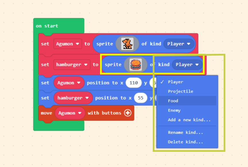 We can categorize sprites into groups to facilitate group control later. In this example, we set the Orange Dinosaur’s kind to “Player” and the Burger’s kind to “Food.” You can define these Kind names yourself.