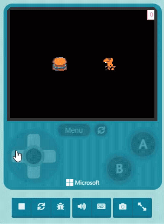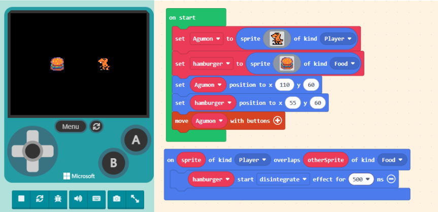 We are going to add conditions to determine victory or defeat, transforming the simple “Orange Dinosaur eats Burger” interaction into an exciting mini-game. For example, we can add a “Scoring Mechanism” where eating a burger adds a point, and the eaten burger “Randomly” respawns elsewhere. Or, we could add “bad food” that gives the dinosaur a stomach ache. As long as you have an idea, you can add it to your game to make it richer.