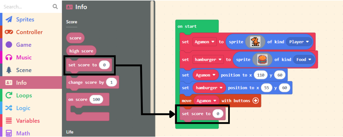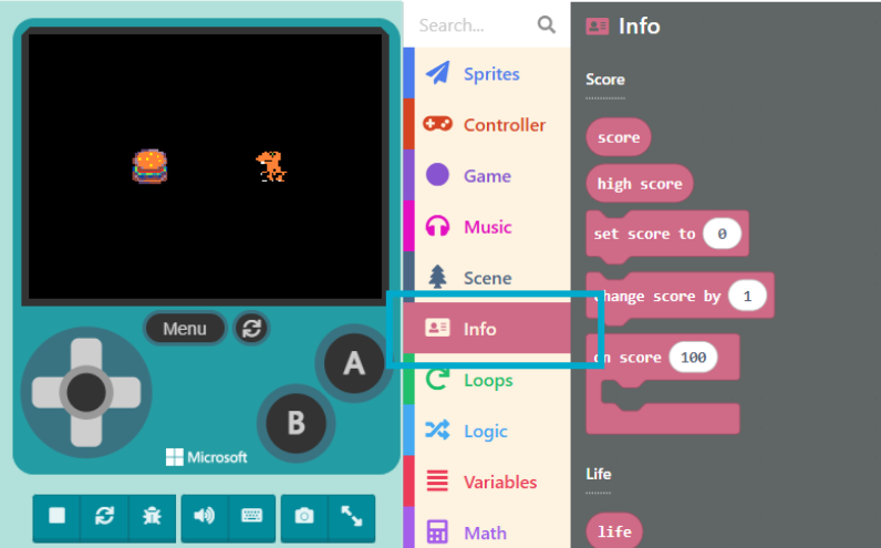 Taking the characters in the image as an example, our idea is: when the Burger is “destroyed“, we “gain points“. In MakeCode Arcade, a group of blocks is dedicated to handling this information: the “Info” category in the Block Toolbox.