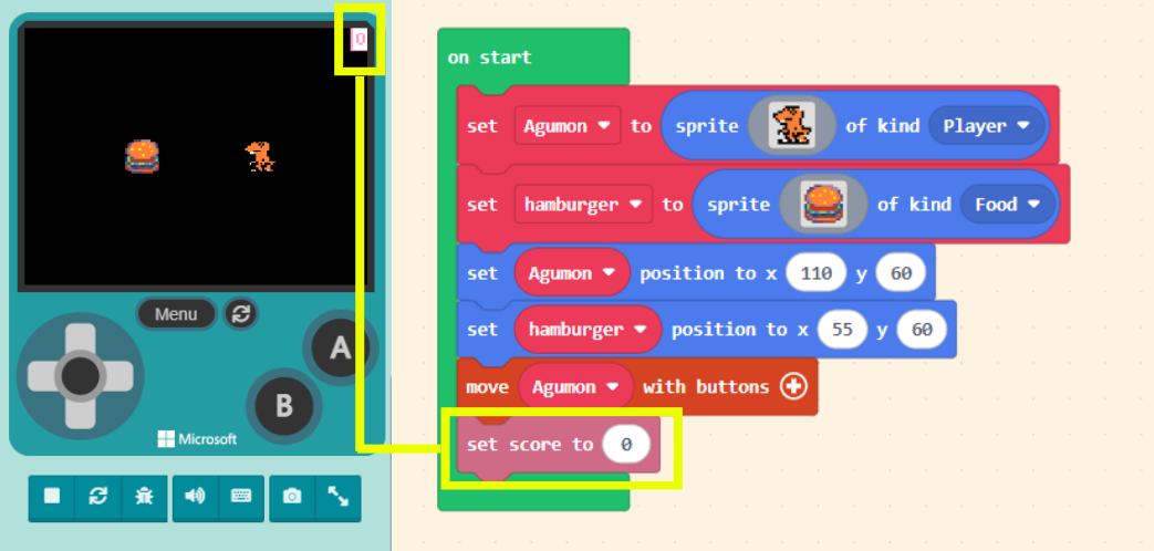 When we drag score-related blocks into the Workspace and assemble the code correctly, a score area will appear in the top-right corner of the Game Simulator.
