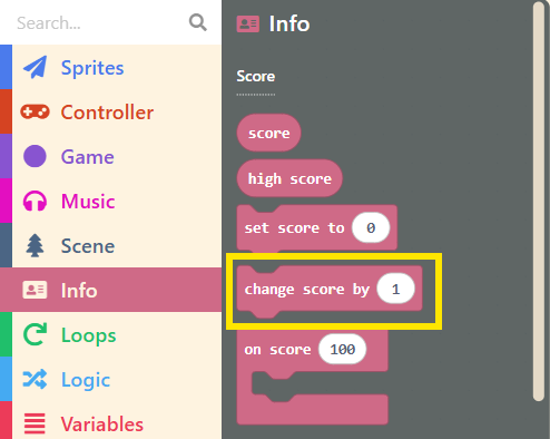 Next, we need a block to help us adjust the score. Also found in “Info,” drag out the “change score by ( 1 )” block.