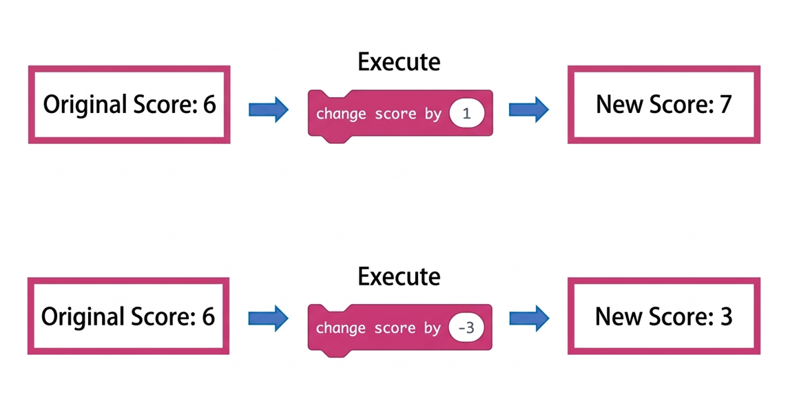 The “1” in “change score by ( 1 )” means adding 1 to the current score. If you enter a negative number, it will subtract from the score, as shown below: