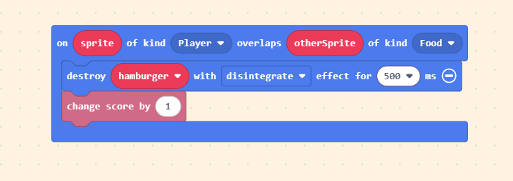 We can add this block to the “code that runs after the burger is eaten.” This way, when the Orange Dinosaur overlaps with the Burger, besides destroying the Burger, we also gain 1 point.