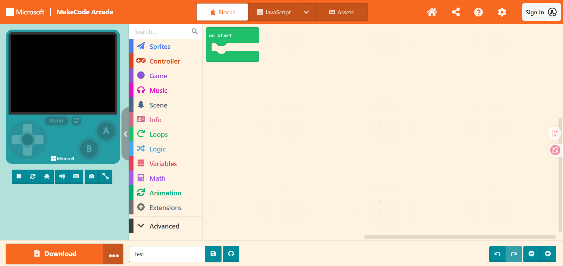 MakeCode Arcade supports a 160×120 pixel display capable of showing 16 colors, along with a 4-channel audio system, enhancing the visual and auditory experience of your games. It also supports up to 8 buttons (4 directional buttons, plus A and B buttons), as well as classic MENU and RESET buttons, mimicking the button layout of the Nintendo Game Boy.